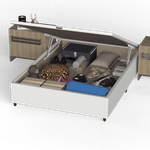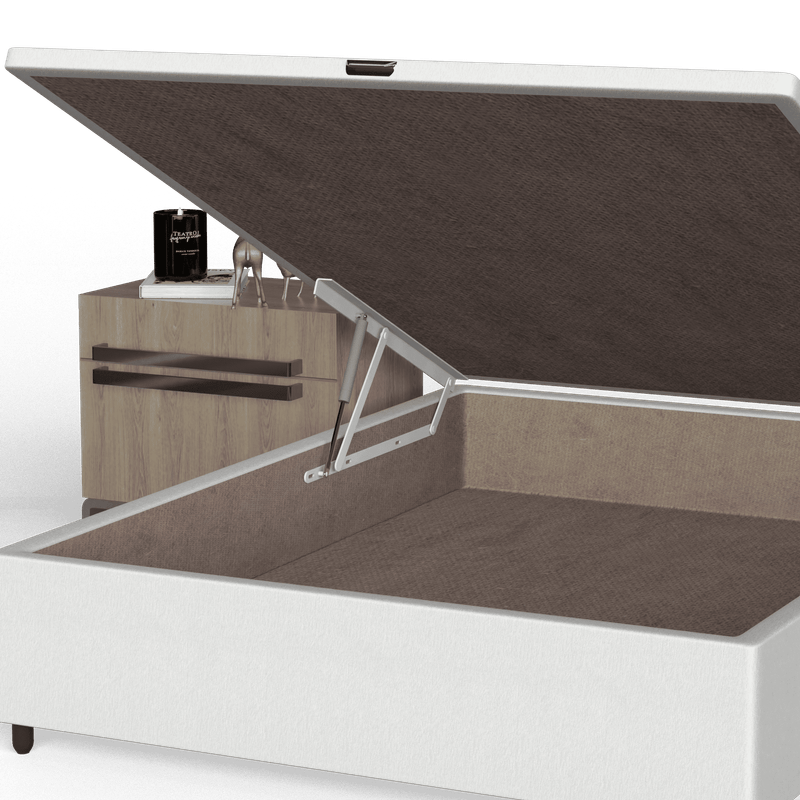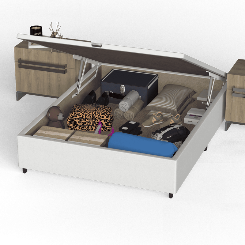 Possui sistema de abertura e fechamento com pistões pneumáticos (amortecedores) que facilitam o manuseio. Sua tampa se mantém aberta sem a necessidade de segurar, deixando um espaço livre entre a estrutura da cama para guardar e organizar objetos.